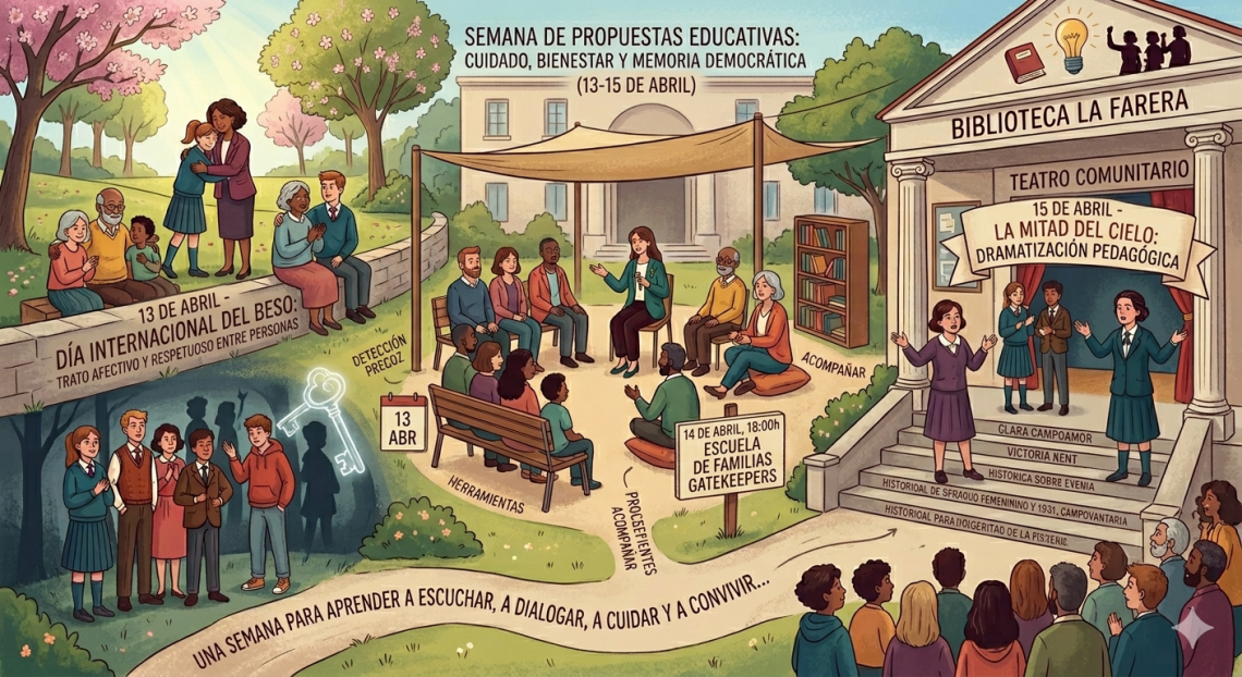 Esta semana contamos con dos propuestas educativas de especial relevancia para nuestra comunidad. Comenzamos recordando que el 13 de abril se celebra el Día Internacional del Beso, una invitación a destacar la importancia del trato afectivo y respetuoso entre las personas. El cuidado en las relaciones es esencial entre profesorado y alumnado y, en general, en toda la sociedad. Hablar de afecto también es educar en relaciones sanas y en el buen trato.