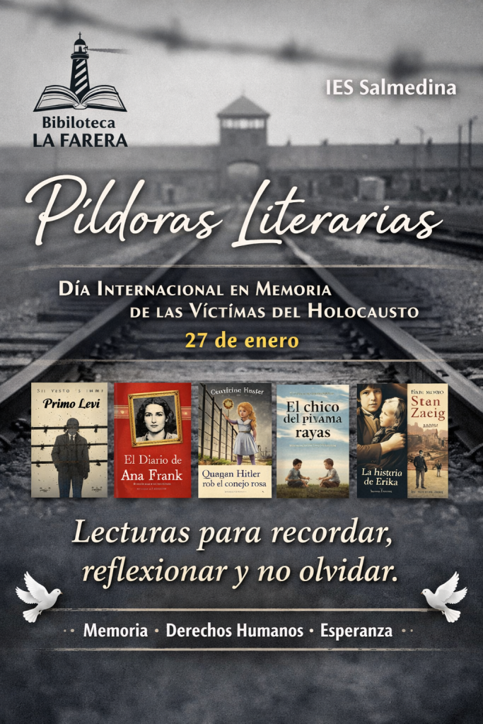 Desde el IES Salmedina, y a través de la Biblioteca La Farera, hemos querido contribuir a esta reflexión con una propuesta sencilla pero cargada de sentido: Píldoras literarias sobre el Holocausto. Fragmentos de obras que ponen voz a las víctimas, a los testigos y a quienes escribieron para que el horror no se diluyera en el olvido.