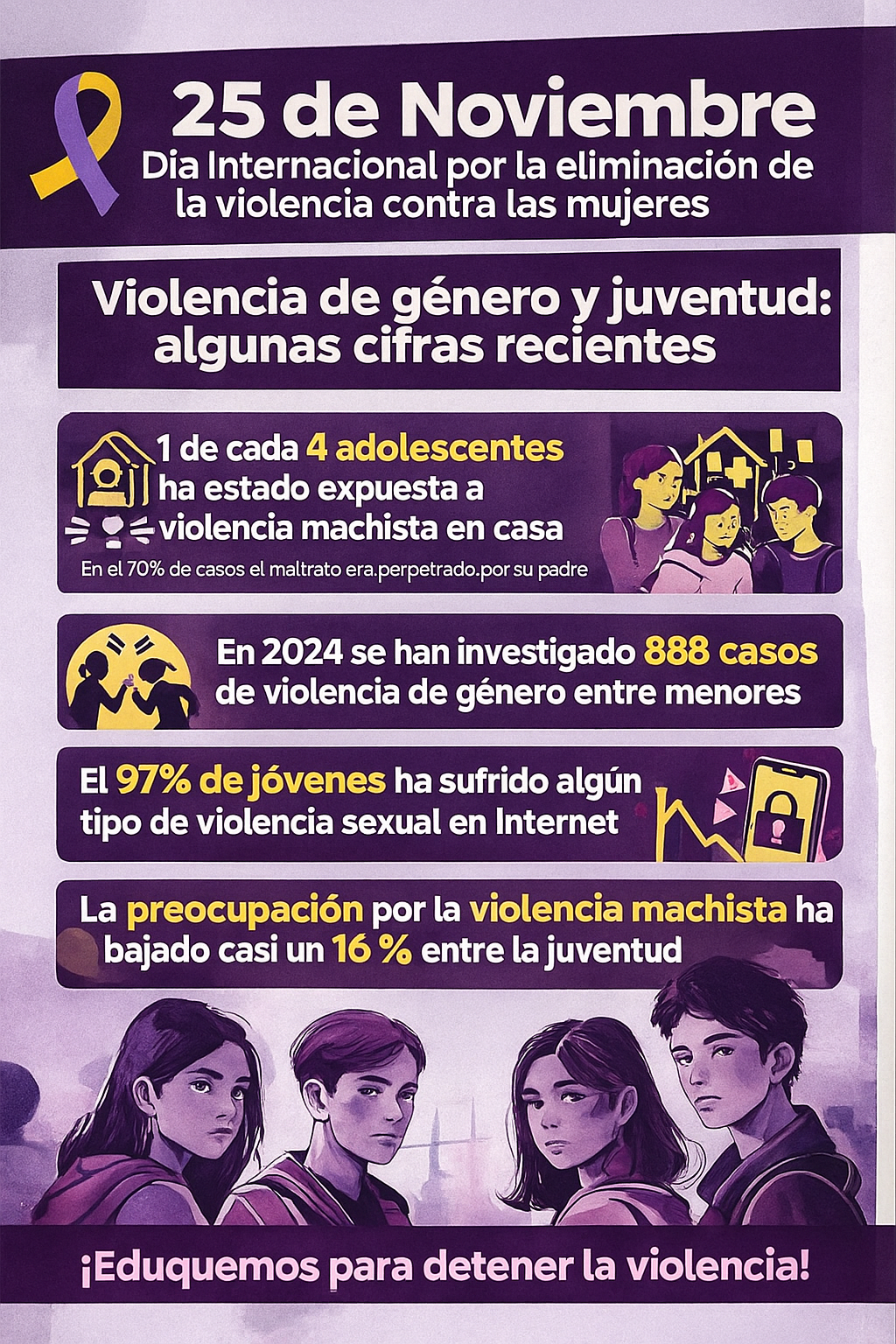 En este 25N no buscamos miedo, sino conciencia y esperanza: que el alumnado identifique relaciones sanas, sepa pedir ayuda y entienda que el amor no duele, que la libertad no se negocia y que la violencia nunca es el camino. Queremos que cada alumno pueda identificar los signos de una relación sana, que sepa pedir ayuda, que aprenda a cuidar y a cuidarse. Queremos que entiendan que el amor nunca duele, que la libertad no se negocia y que la violencia jamás es un camino.