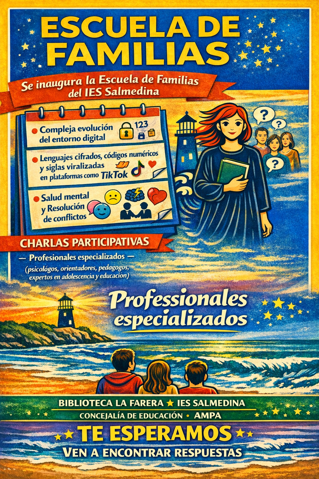 Desde la Coordinación de la Biblioteca Escolar «La Farera», nos hace mucha ilusión comunicaros que, fruto del compromiso compartido por el Instituto, la Concejalía de Educación y el AMPA, arranca oficialmente la Escuela de Familias del IES Salmedina.